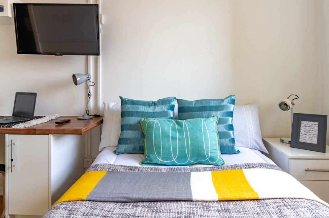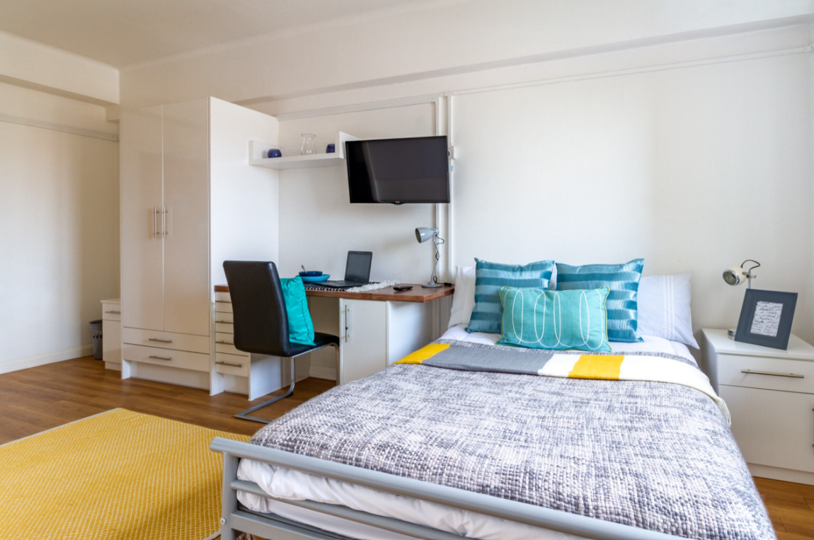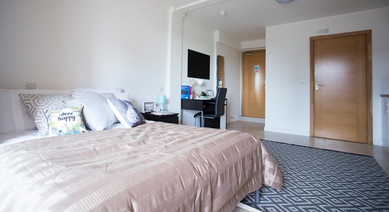 Studio apartment room with a comfy bed